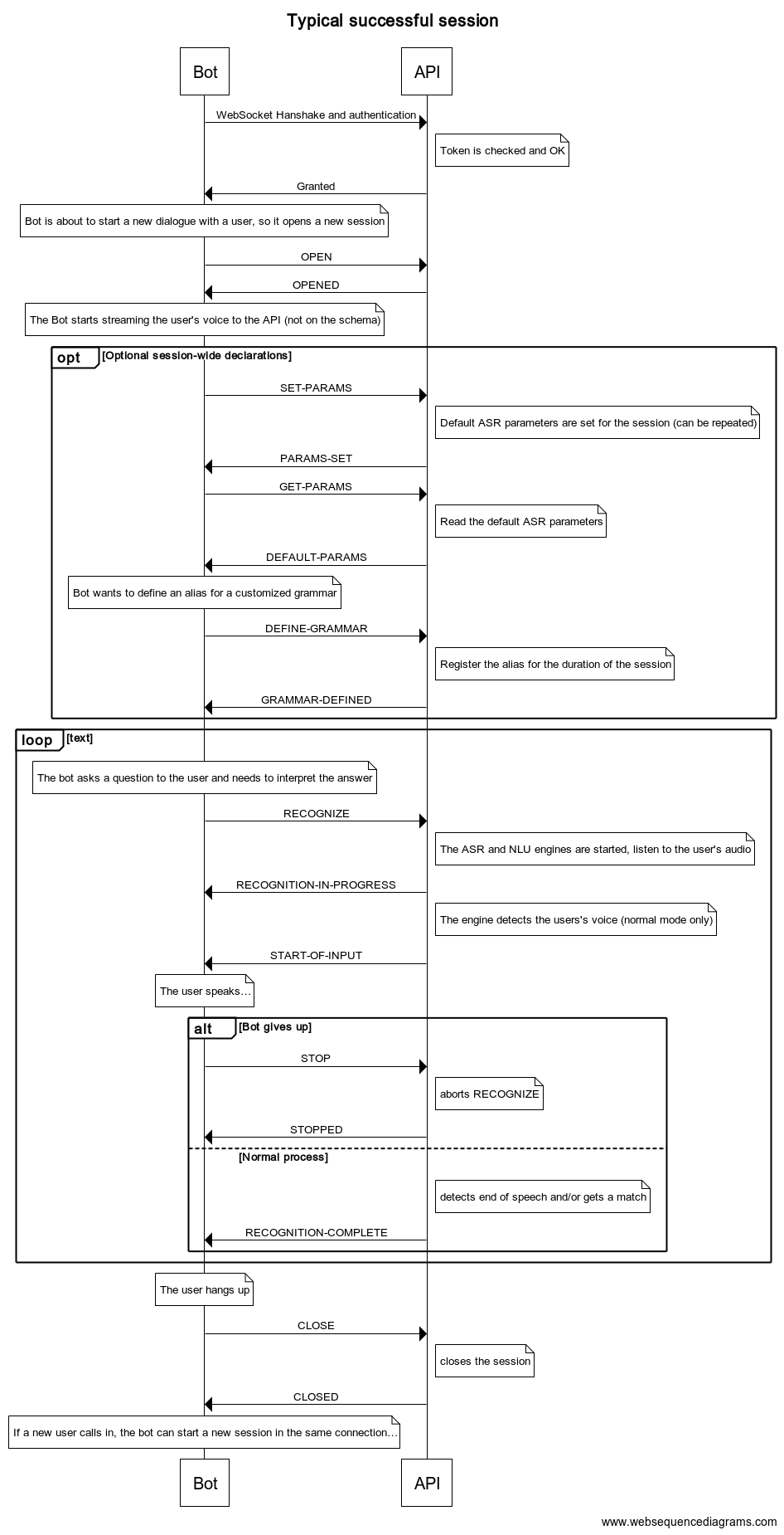 Contrary to the conversation based API, only one speaker audio is streaming during a session and the ASR doesn't run continuously. The ASR+NLU is started by a recognition request when the client needs it, and it stops when the expected information is found or when some timer expires. The client describes the information it expects by one or more grammars. A grammar is a kind of preset identified by an URI that will set up both our ASR and NLU engines for the task. Some of these presets can be further customized by the client by passing parameters to them in a "query" string.